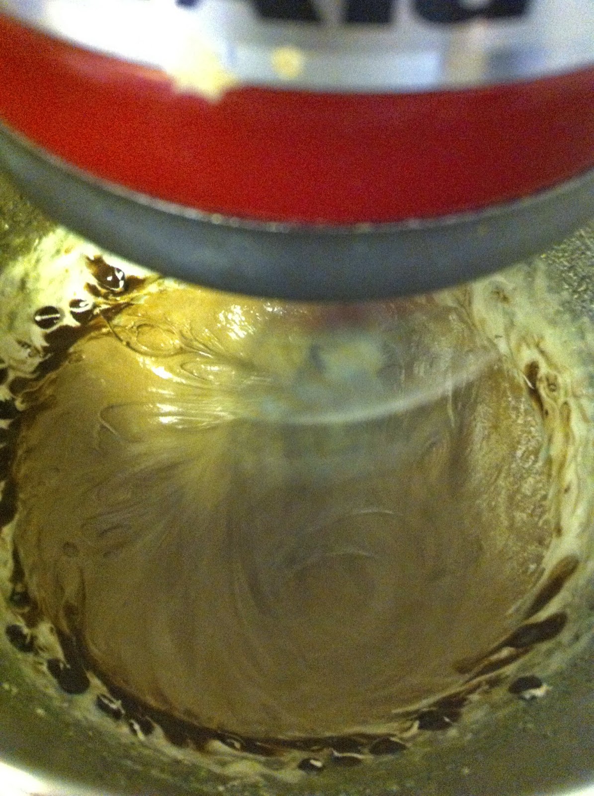 - Häll den kokande sockerlagen direkt ner i marängen under kraftig vispning. Här tillsätts även den smälta chokladen om du vill göra chokladvarianten. Vispa massan på låg hastighet i ca 5 minuter.